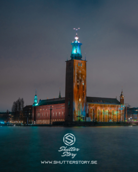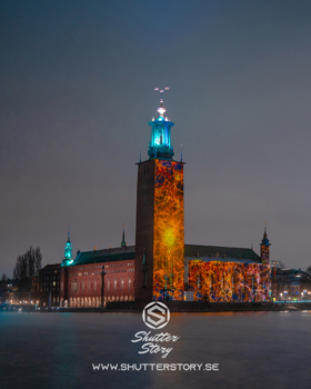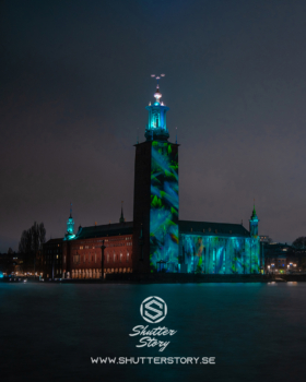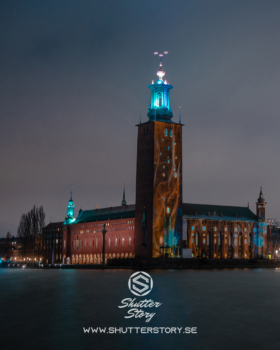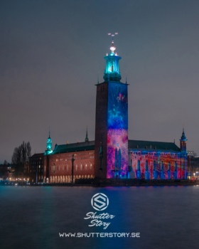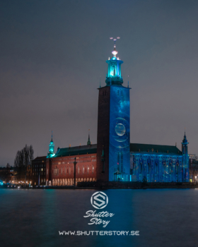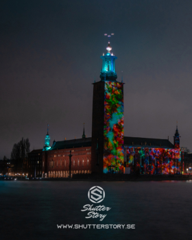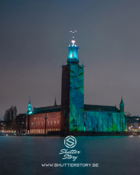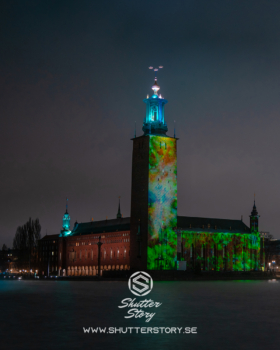 Stockholm city hall light painted during Nobel Week Lights 2022 in Stockholm, Sweden